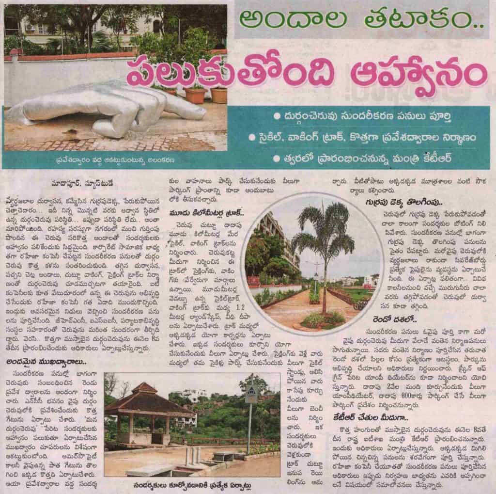 We are all set for the inauguration and opening of the lake tomorrow, and the first story has appeared in the Eenadu newspaper, Hyderabad’s leading daily.